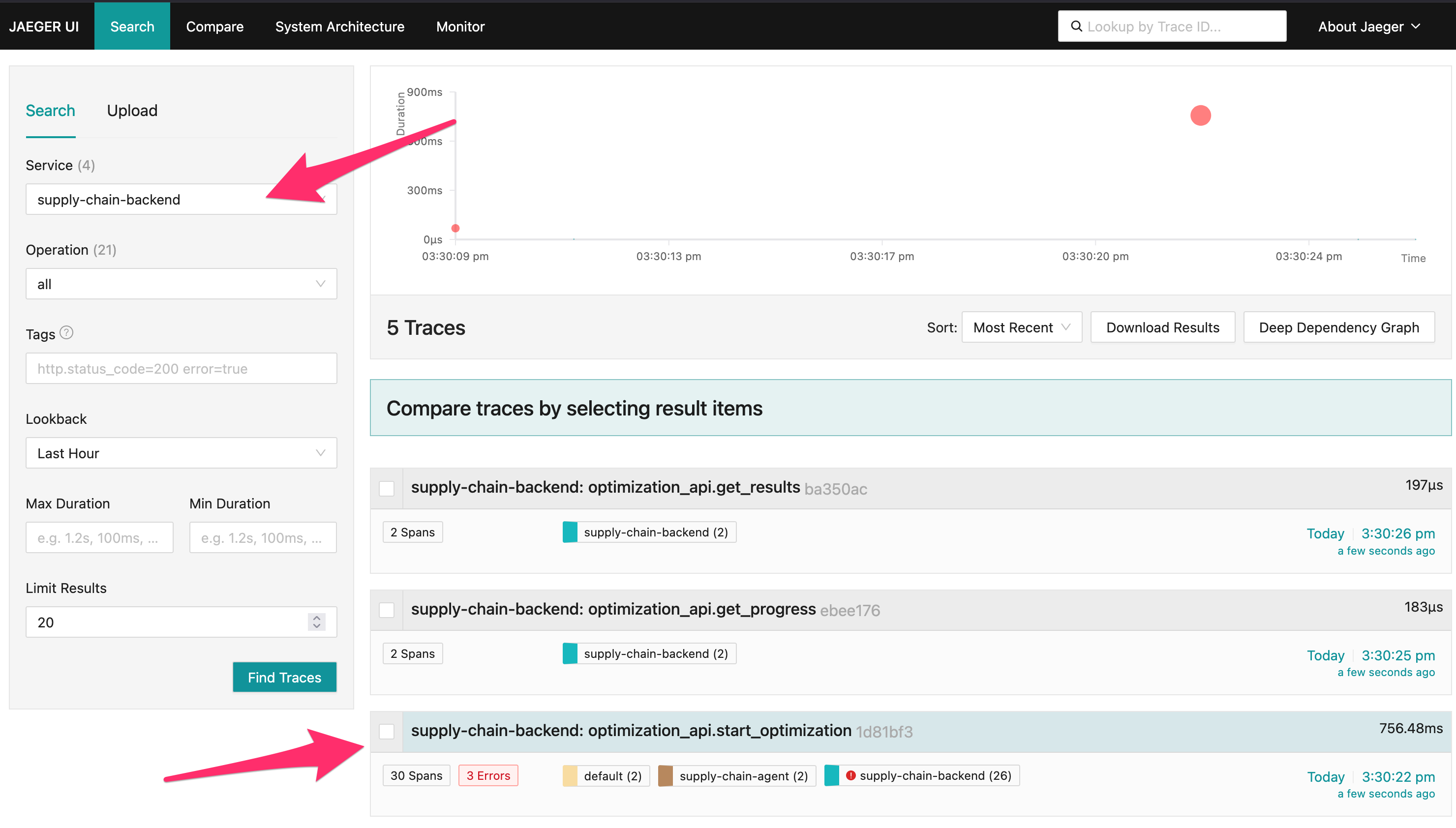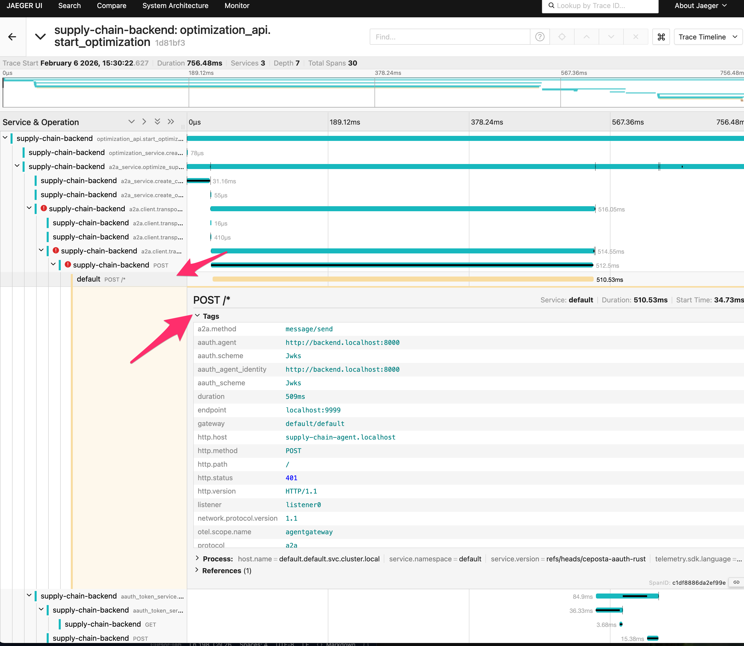 If you click a traceoptimization_api.start_optimization you’ll see the full flow. This will show the first call from backend to supply-chain-agent that fails, and how the supply-chain-agent responds.