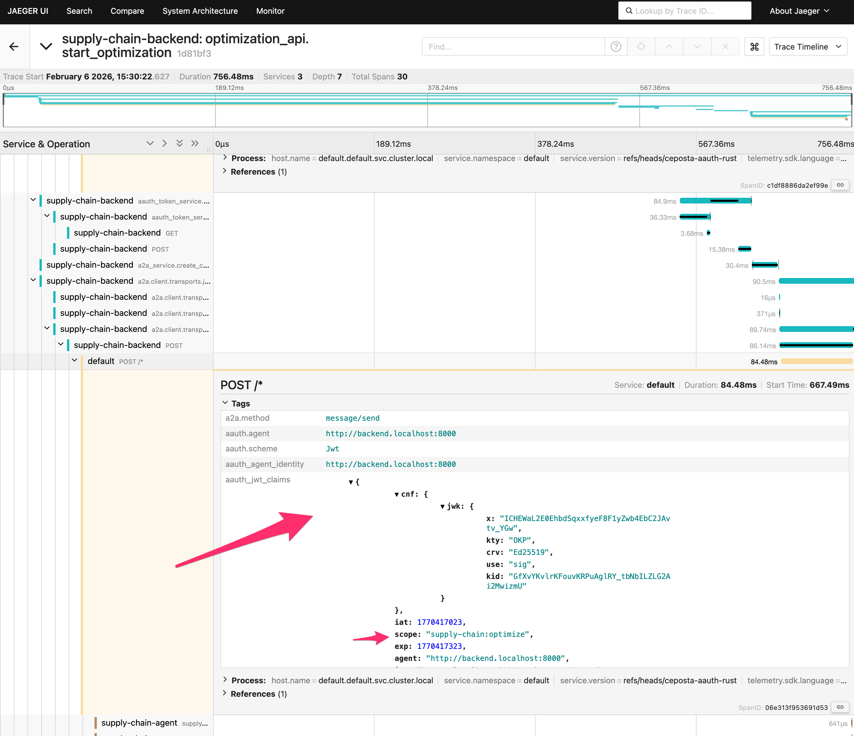 Please see the Authorization flow to understand these claims in more detail. To keep it short, this token proves that backend was trying to call supply-chain-agent and the scopes necessary to make this call. The aud for this is the Authorization Server (Keycloak in our demo) that the Agent trusts.