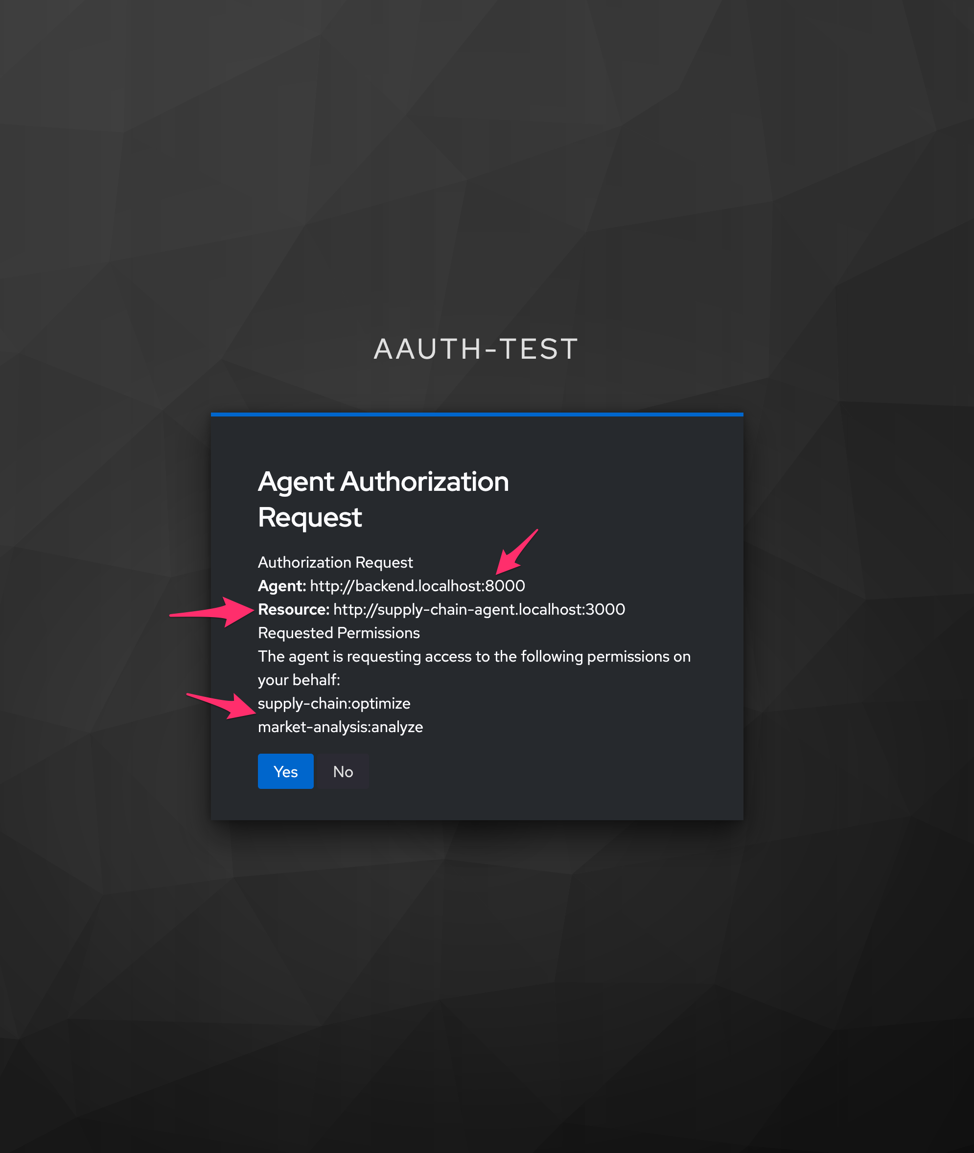 When the backend calls the supply-chain-agent, it receives a 401 with a resource token (same as autonomous flow):
