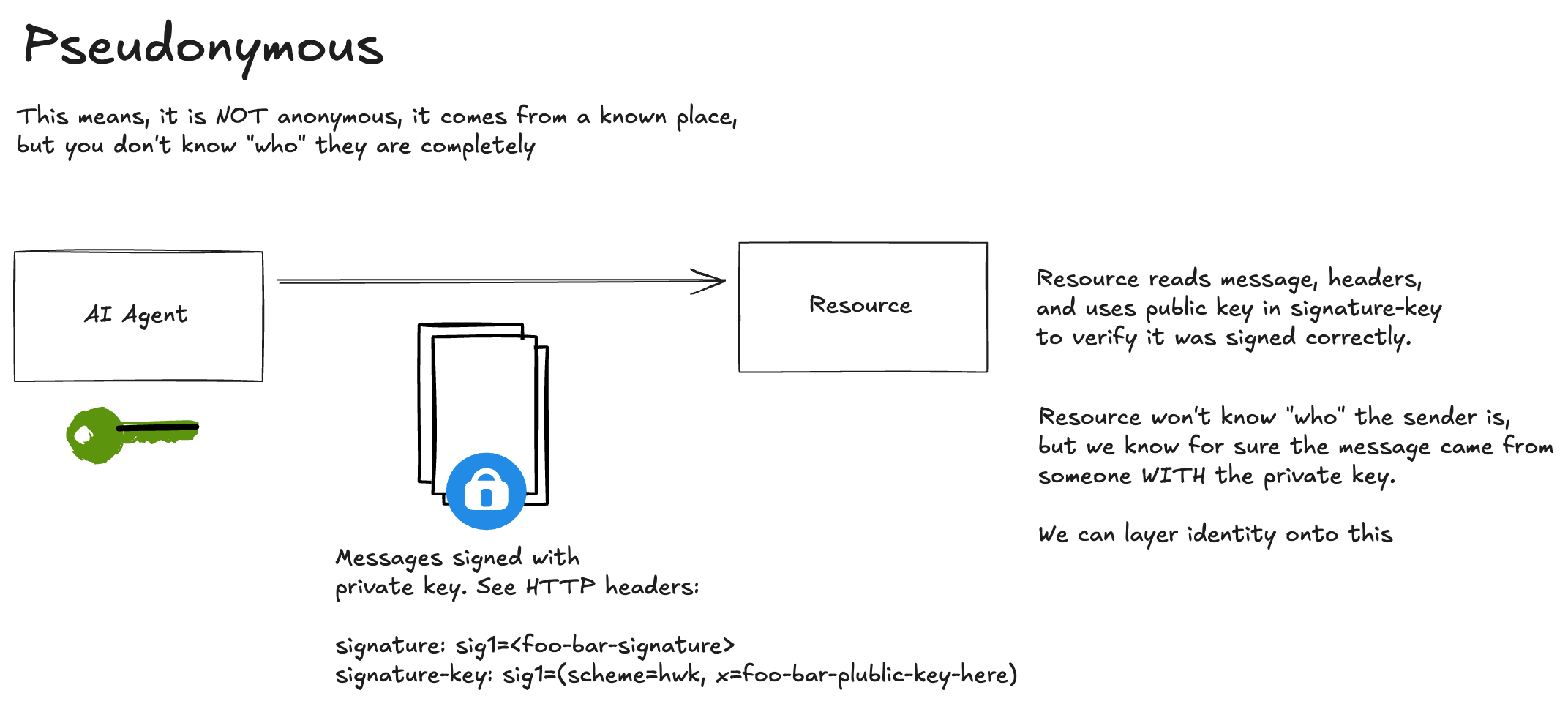 With pseudonymous settings, an agent proves it can sign requests cryptographically without revealing a persistent identity. The resource can verify that: