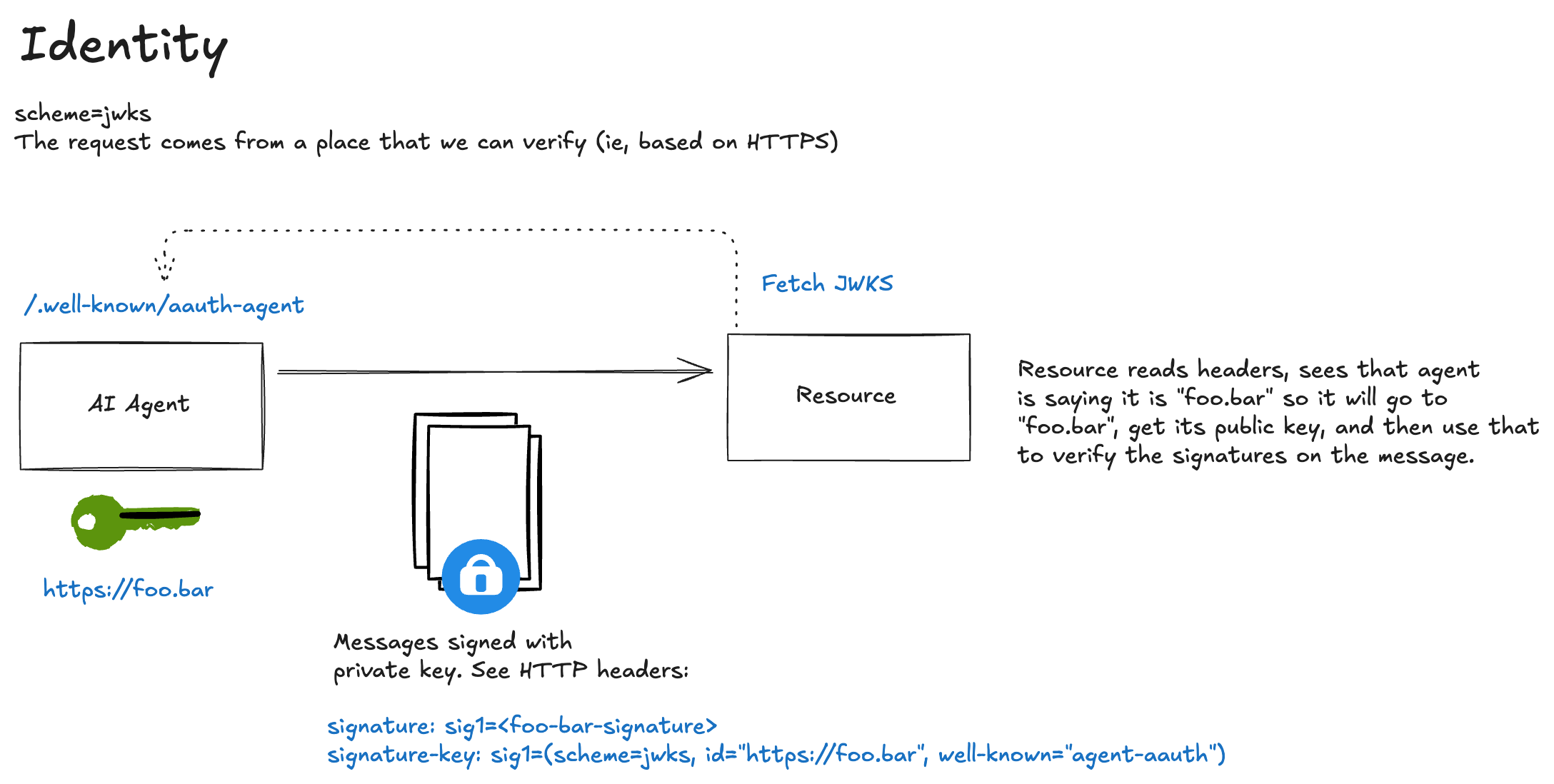 With identified scheme, an agent proves it controls keys published at a well-known URL. The resource can verify that: