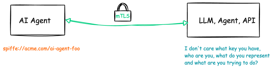 Instead of using API keys or traditional long-lived authentication tokens, SPIFFE (Secure Production Identity Framework For Everyone) assigns each service a cryptographic identity that uniquely identifies workloads in a zero-trust architecture. This can be used for LLM clients/chat bots/AI agents on both the caller and potentially the target side. If the target is a hosted/external service, we have other options (see below)