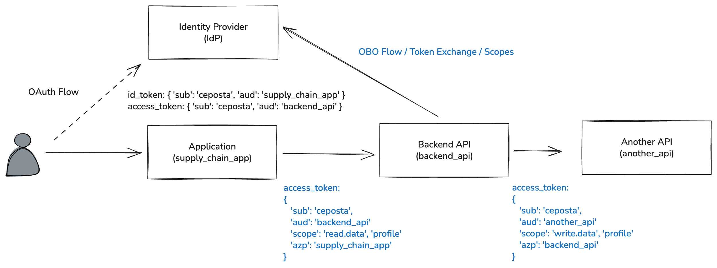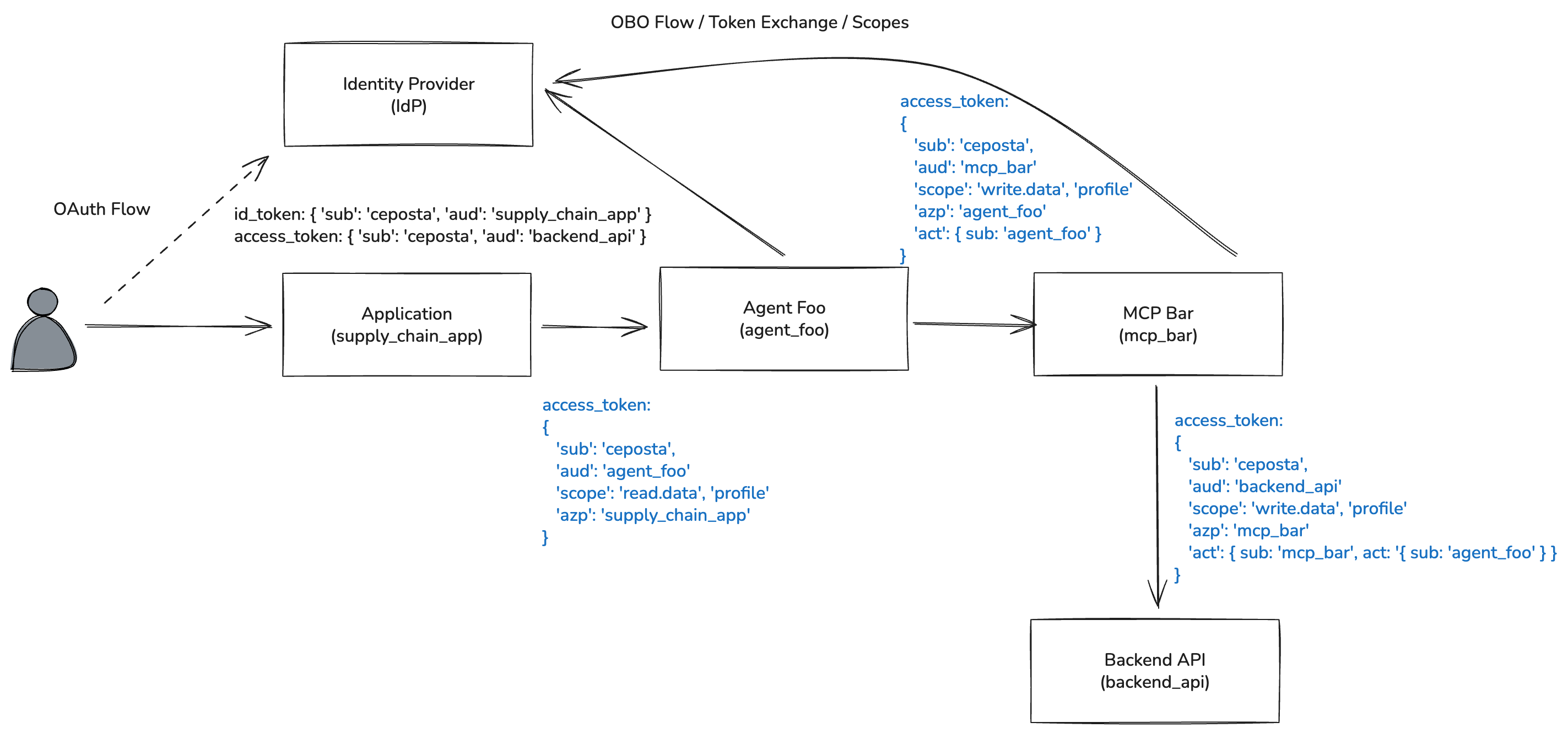 To support these requirements, we need to be able to do OBO/Token Exchange that not only preserves the User’s identity, but also makes clear the Agent identity, who authorized the call, and what caused the calls.
