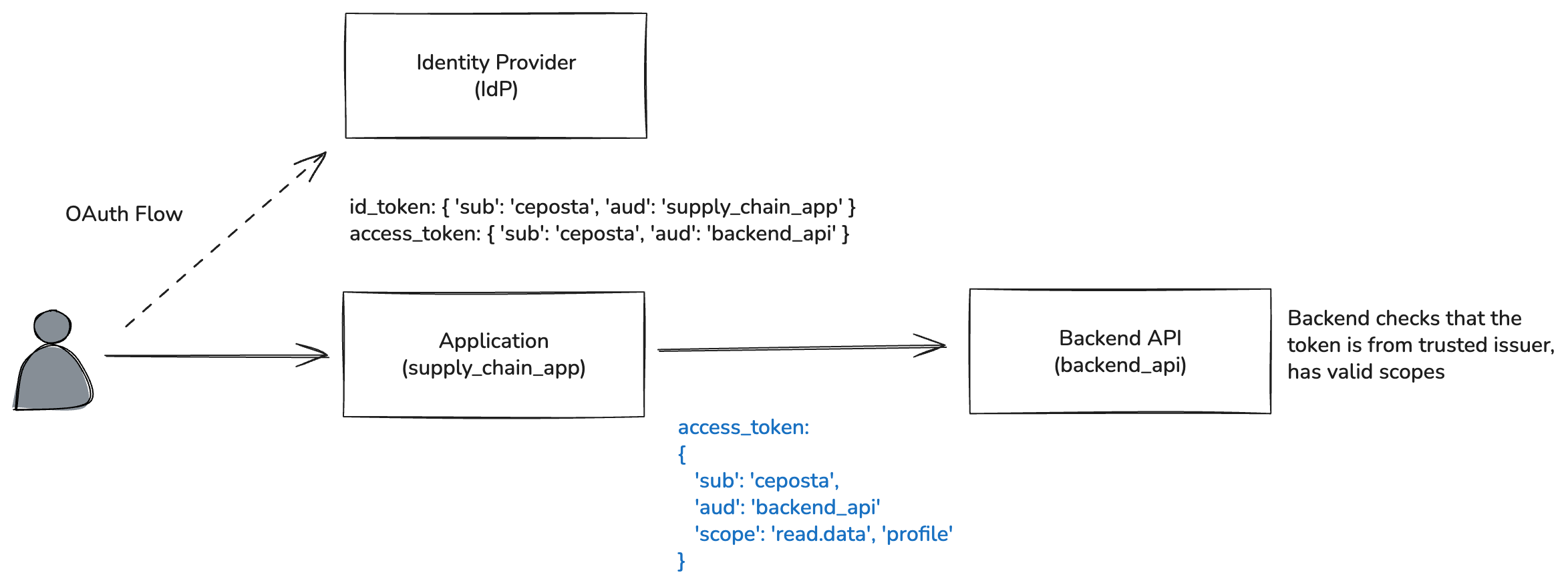 In OAuth terms, the user is the resource owner, the application is the client, and the backend API is the resource server.