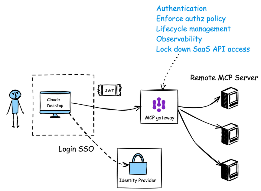 And we can improve this, just like we did with APIs and API gateways. Instead of having each API endpoint/service try to implement its own rate limiting, authentication/authorization, obserability/metrics collection, policy enforcement, et. al, we can leverage a Agent/MCP gateway to consistently handle this for ALL remote MCP servers whether first party, third party, or SaaS:
